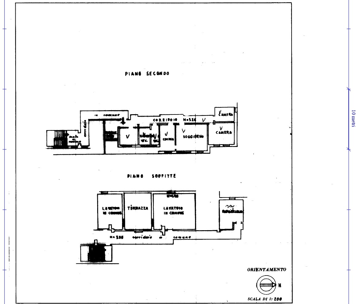 Attualmente l'appartamento è composto da: ingresso, spazioso corridoio che porta alla cucina separata, ampio soggiorno, tre stanze a scalare, due bagni finestrati, spazi comuni e terrazza. Soffitta all'ultimo piano.