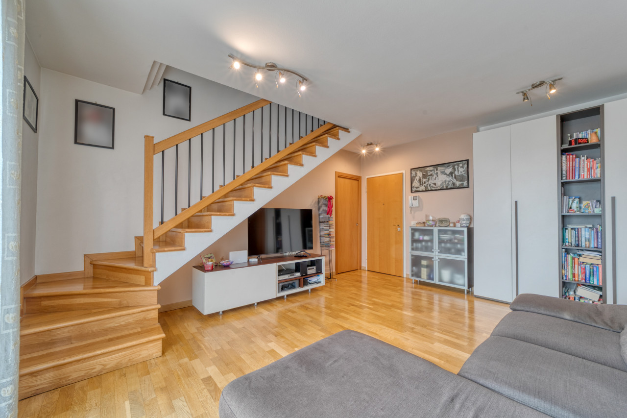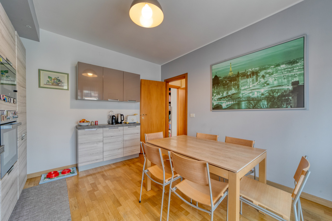 Nel cuore di Saccolongo, a pochi passi dalla chiesa e dai principali servizi del paese, proponiamo in vendita un raffinato appartamento duplex di 120 mq situato al terzo e quarto piano di un recente condominio dotato di ascensore. L’ingresso si apre su un luminoso soggiorno con pavimento in parquet chiaro, ampio divano angolare e grandi vetrate che affacciano su un poggiolo privato con vista aperta sul quartiere residenziale circostante. La zona giorno è completata da una cucina abitabile separata, anch’essa con accesso al balcone, un pratico ripostiglio e un bagno finestrato con antibagno.