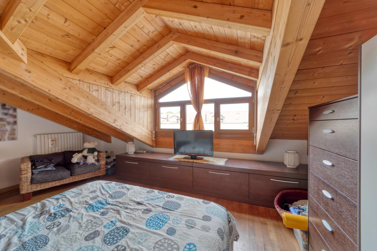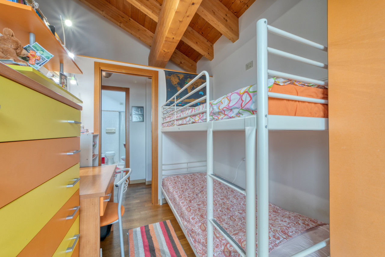 Una comoda scala in legno conduce al piano superiore dove si trova la zona notte caratterizzata da travi a vista, un secondo bagno e uno spazio versatile ideale come camera matrimoniale o studio, arricchito da abbaino che dona luce naturale. La seconda cameretta si apre su un poggiolo privato perfetto per momenti di relax all’aperto.