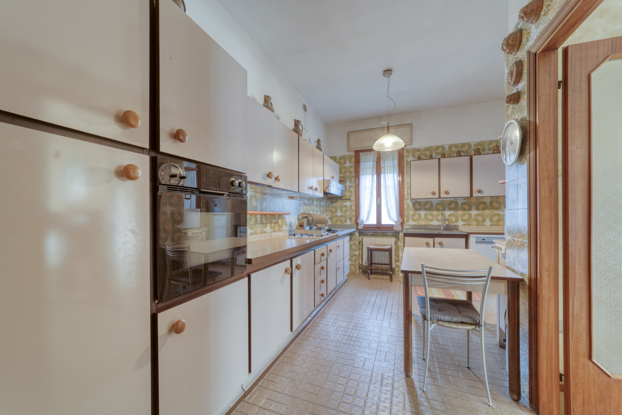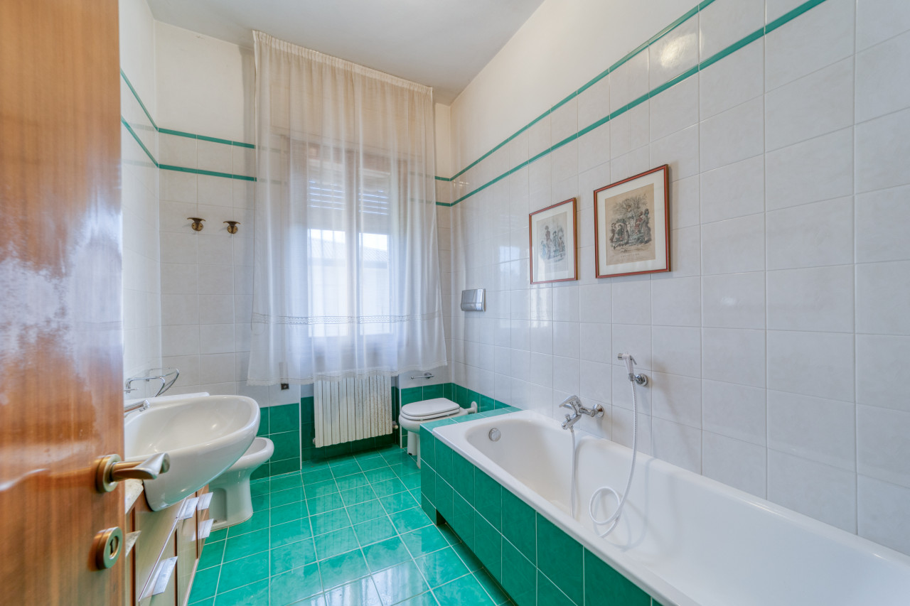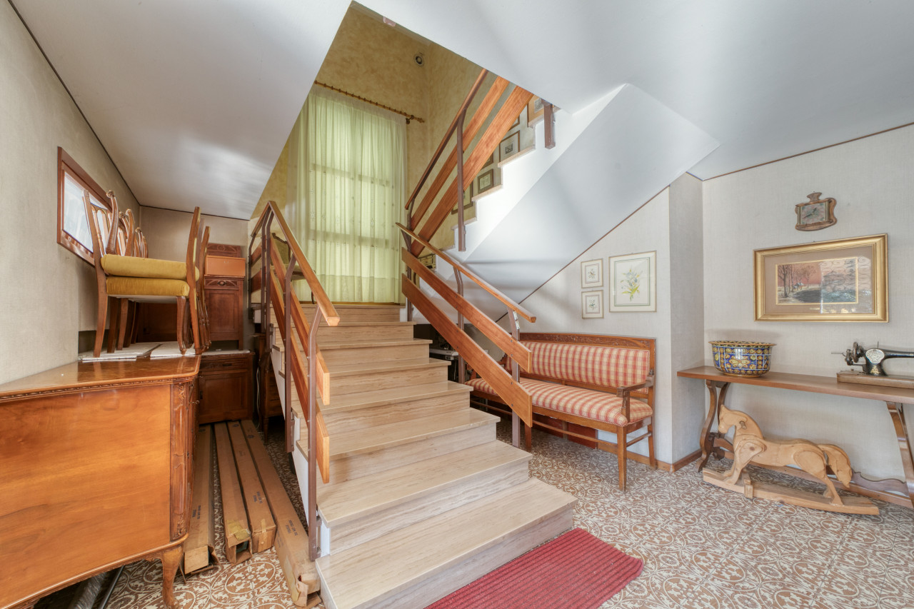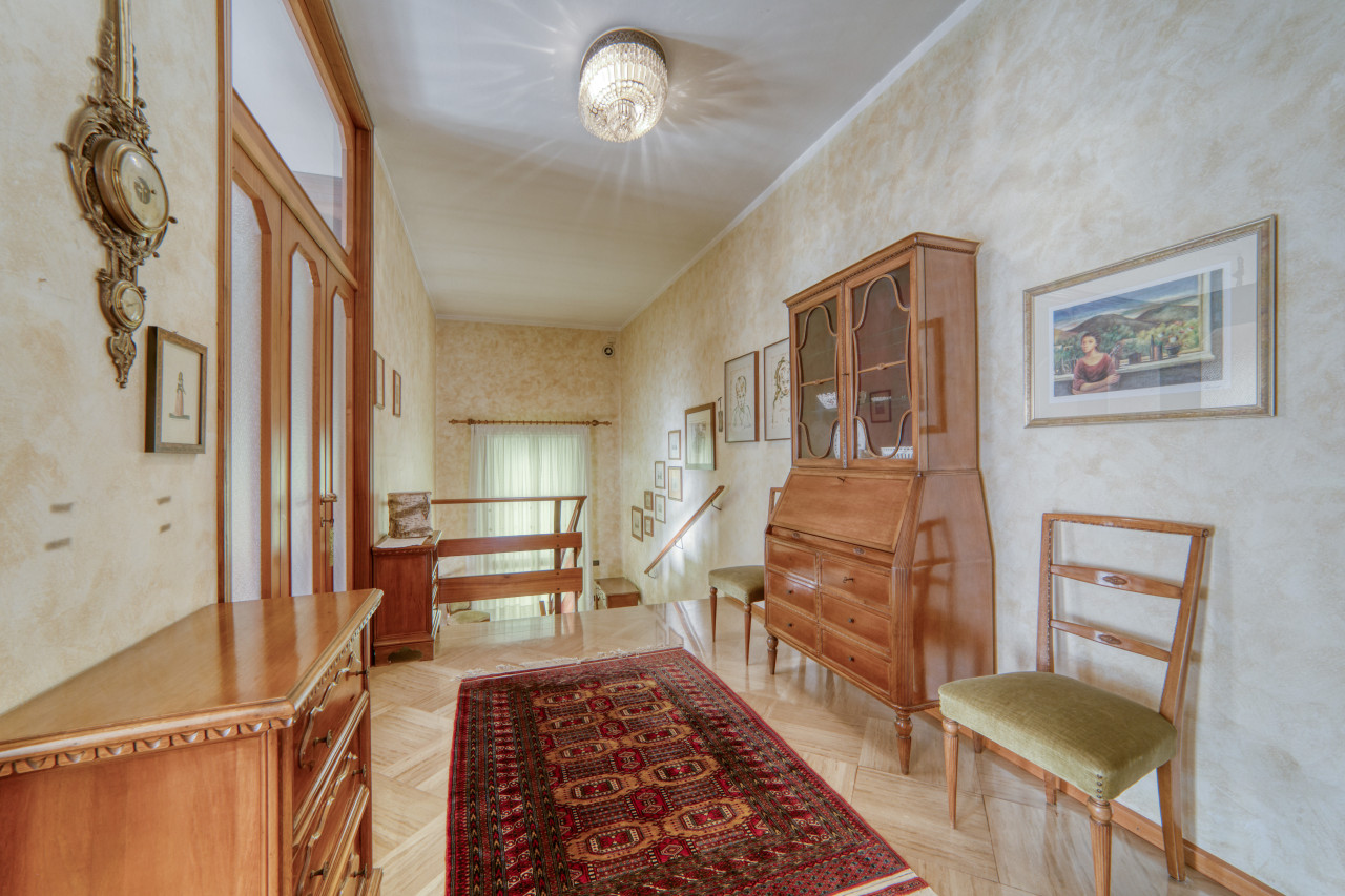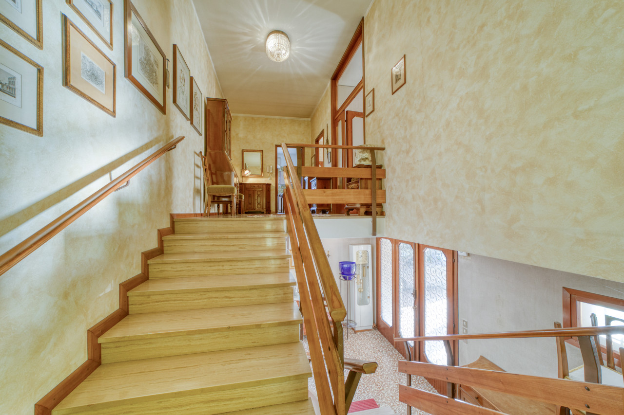 - piano primo: una bella scala ampia e comoda porta all'ingresso dell'appartamento principale, dal corridoio centrale si apre la zona giorno con cucina separata di mq. 13, zona pranzo e soggiorno attualmente separate ma unendole si può creare una zona soggiorno di mq.33 con uscita verso il poggiolo, la zona notte, allo stesso piano, è composta da 3 camere da letto ampie con uscita nel secondo poggiolo che ha la vista aperta sul verde, due bagni (rifatti nel 1998) e una zona armadi lunga come il corridoio notte.
