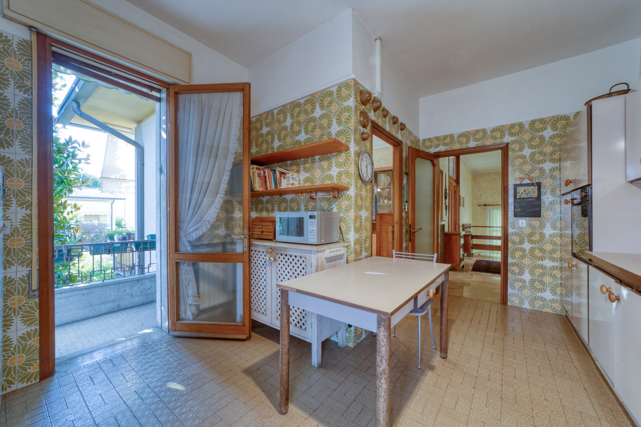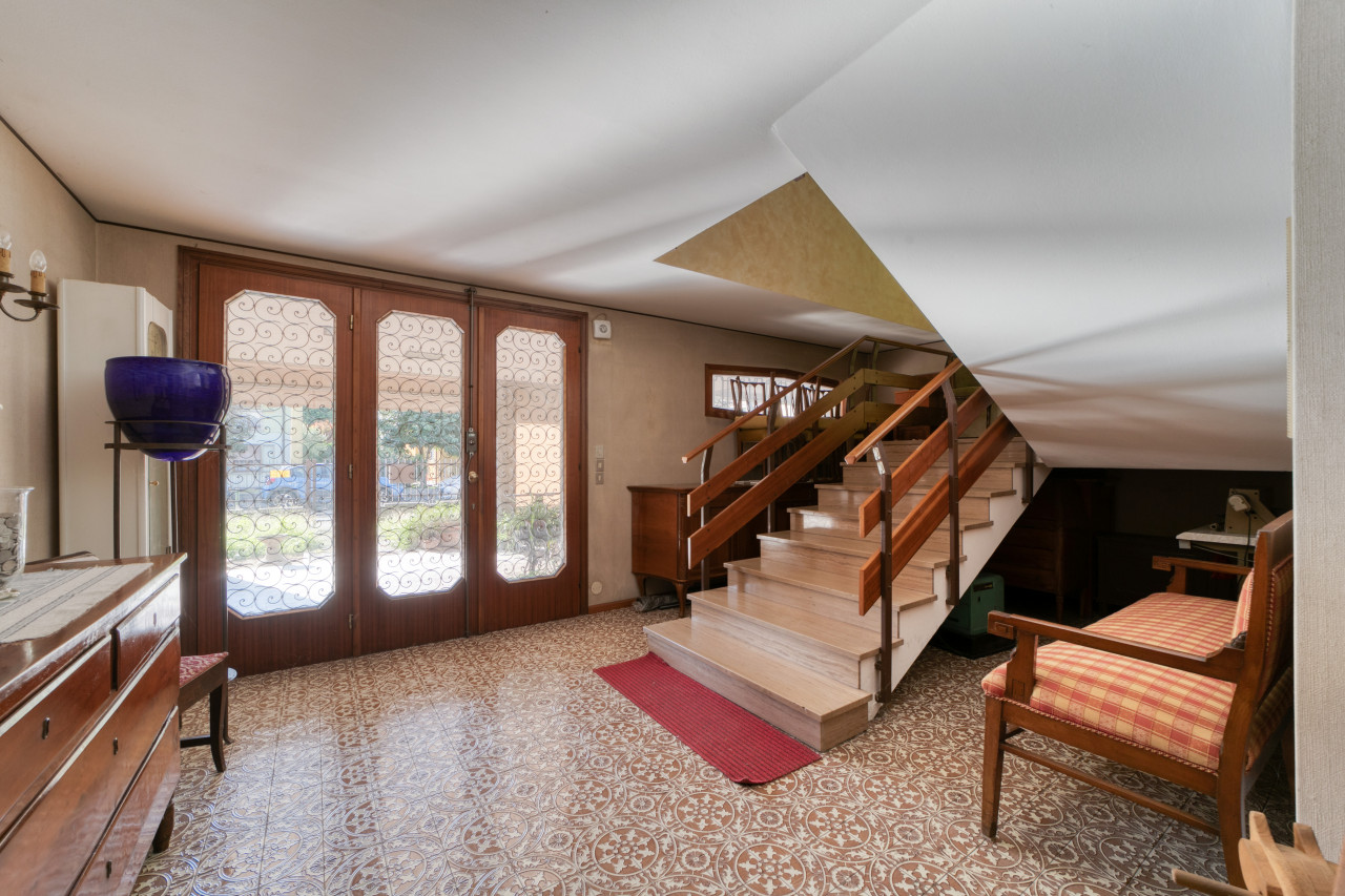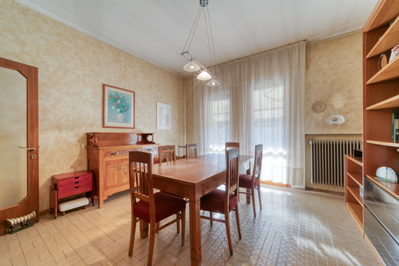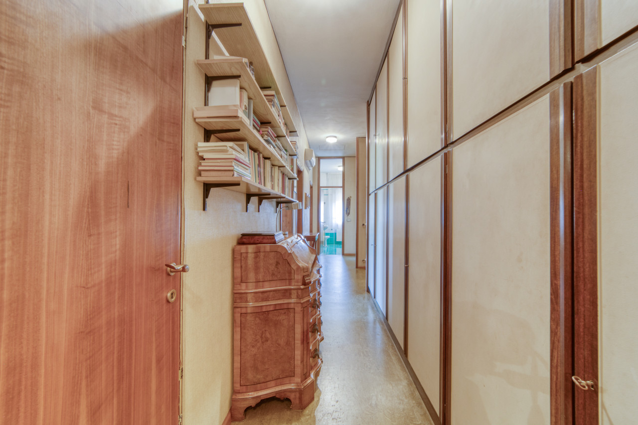 - piano primo: una bella scala ampia e comoda porta all'ingresso dell'appartamento principale, dal corridoio centrale si apre la zona giorno con cucina separata di mq. 13, zona pranzo e soggiorno attualmente separate ma unendole si può creare una zona soggiorno di mq.33 con uscita verso il poggiolo, la zona notte, allo stesso piano, è composta da 3 camere da letto ampie con uscita nel secondo poggiolo che ha la vista aperta sul verde, due bagni (rifatti nel 1998) e una zona armadi lunga come il corridoio notte.