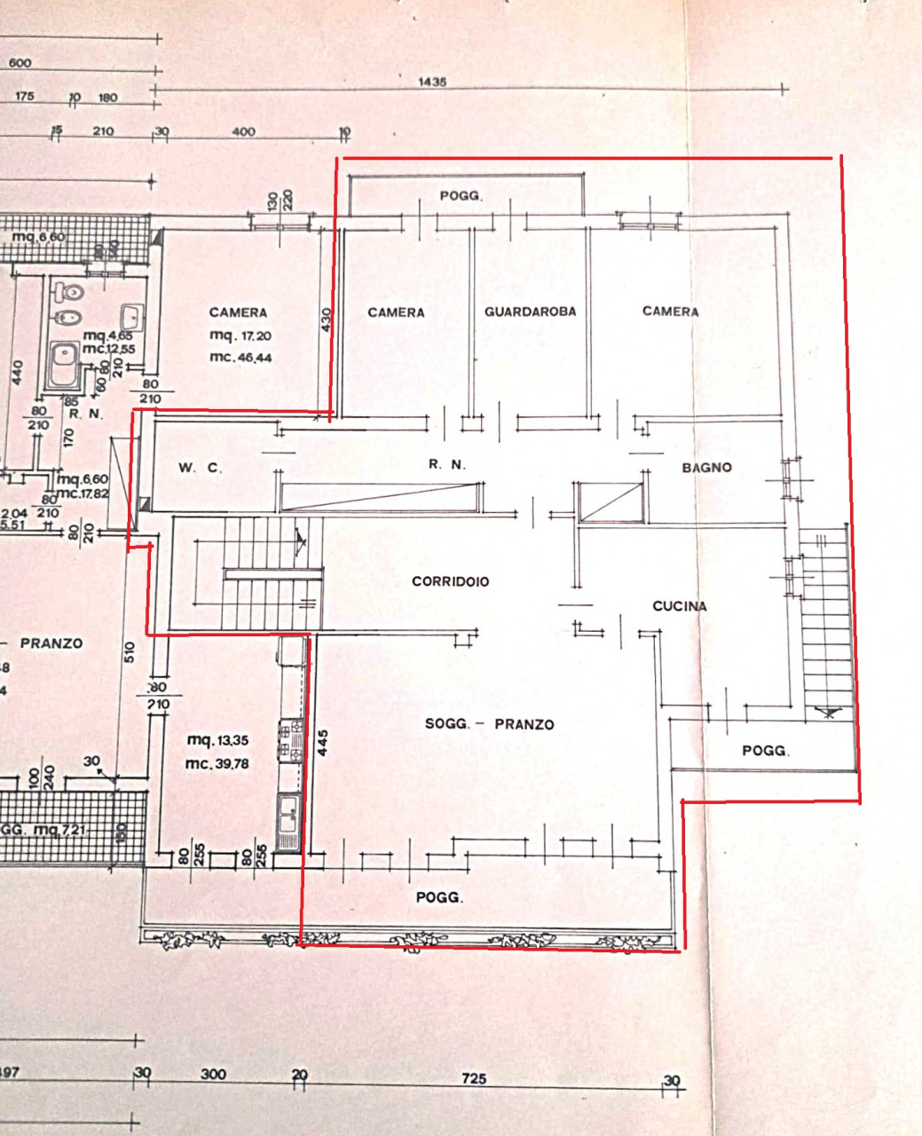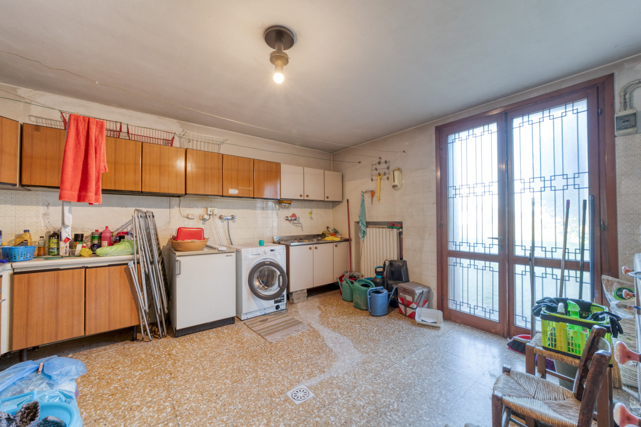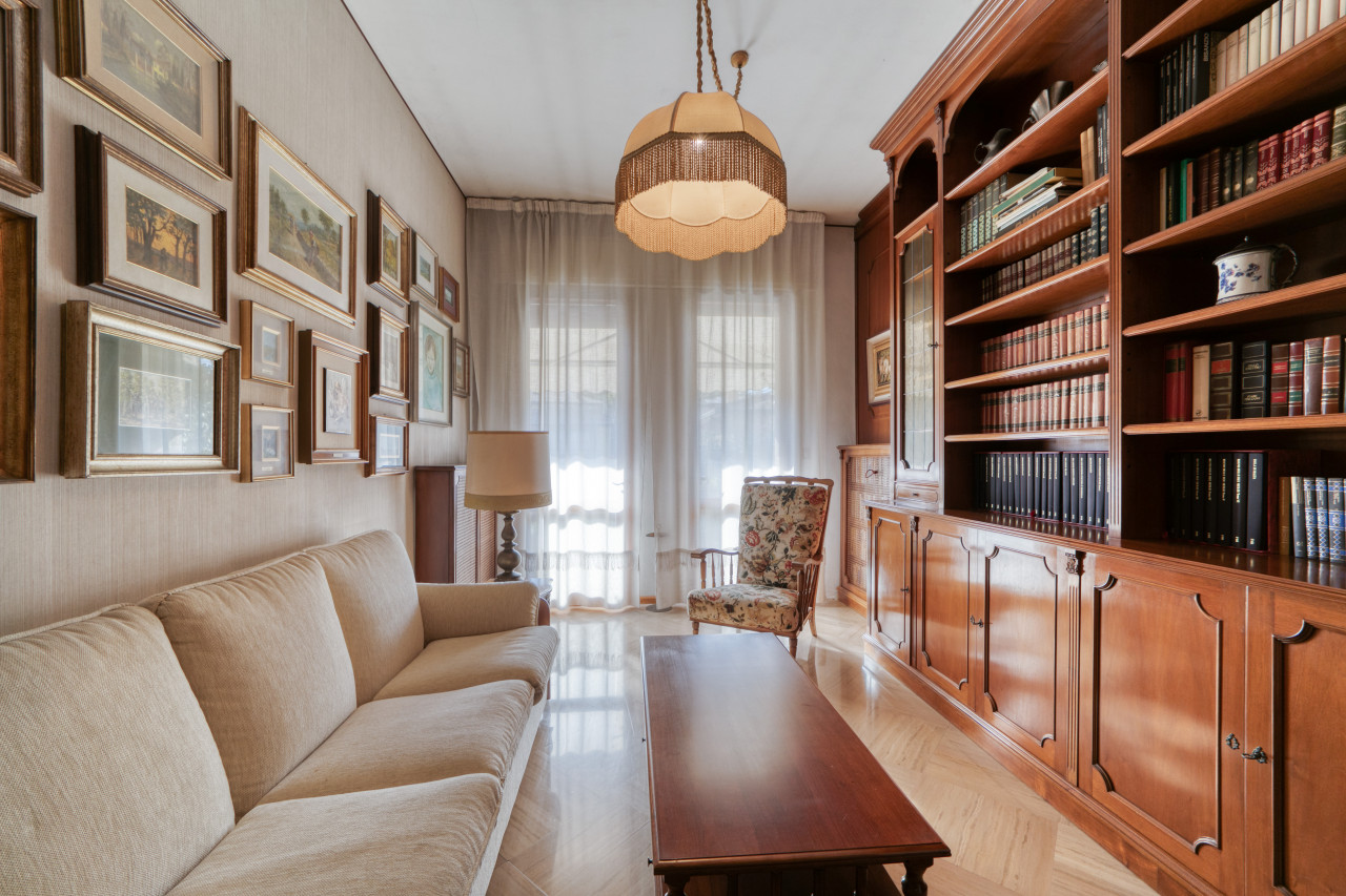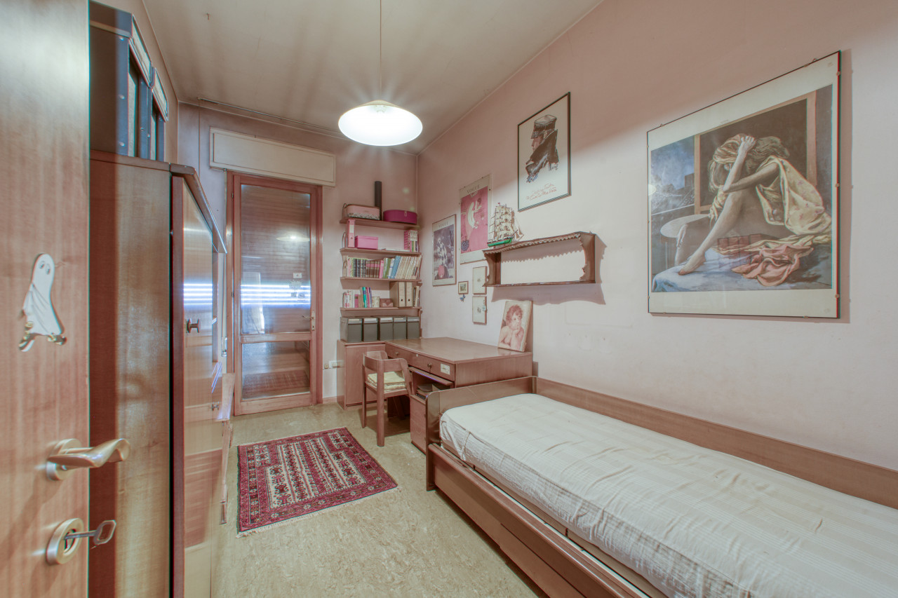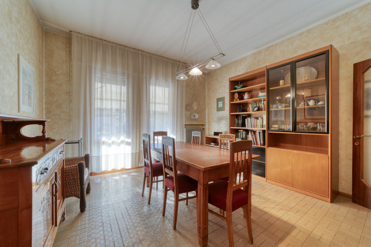 - piano primo: una bella scala ampia e comoda porta all'ingresso dell'appartamento principale, dal corridoio centrale si apre la zona giorno con cucina separata di mq. 13, zona pranzo e soggiorno attualmente separate ma unendole si può creare una zona soggiorno di mq.33 con uscita verso il poggiolo, la zona notte, allo stesso piano, è composta da 3 camere da letto ampie con uscita nel secondo poggiolo che ha la vista aperta sul verde, due bagni (rifatti nel 1998) e una zona armadi lunga come il corridoio notte.