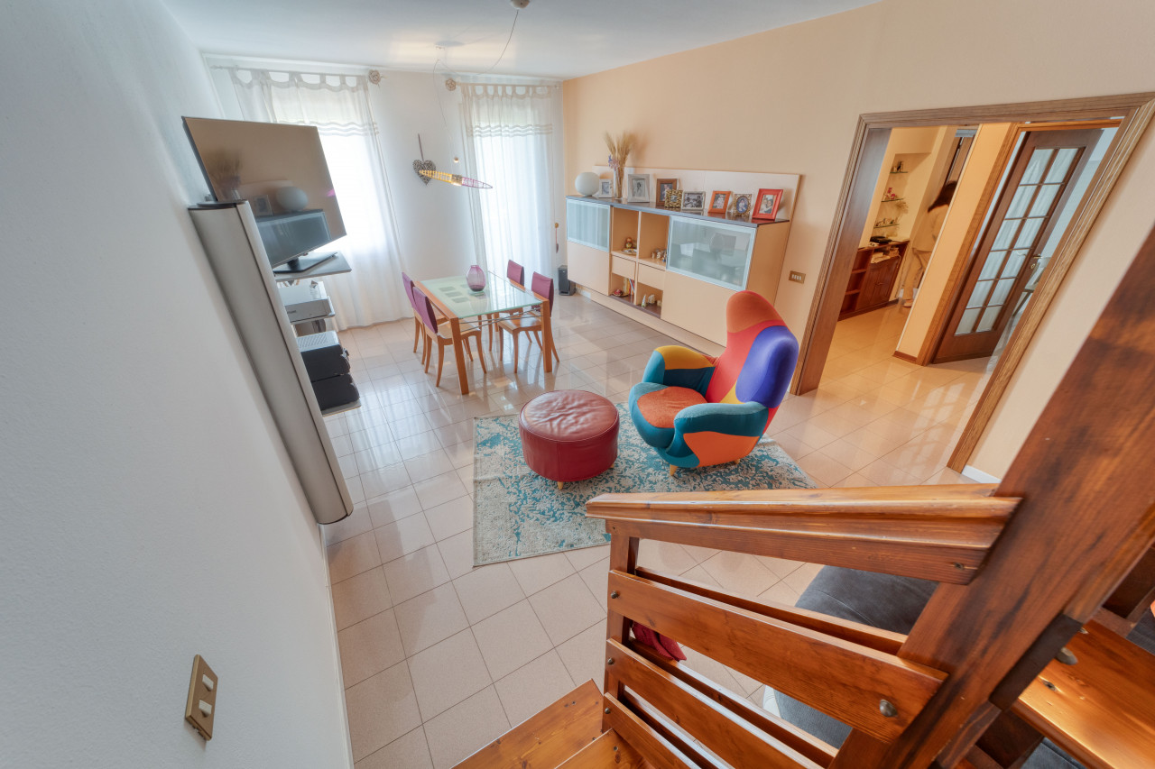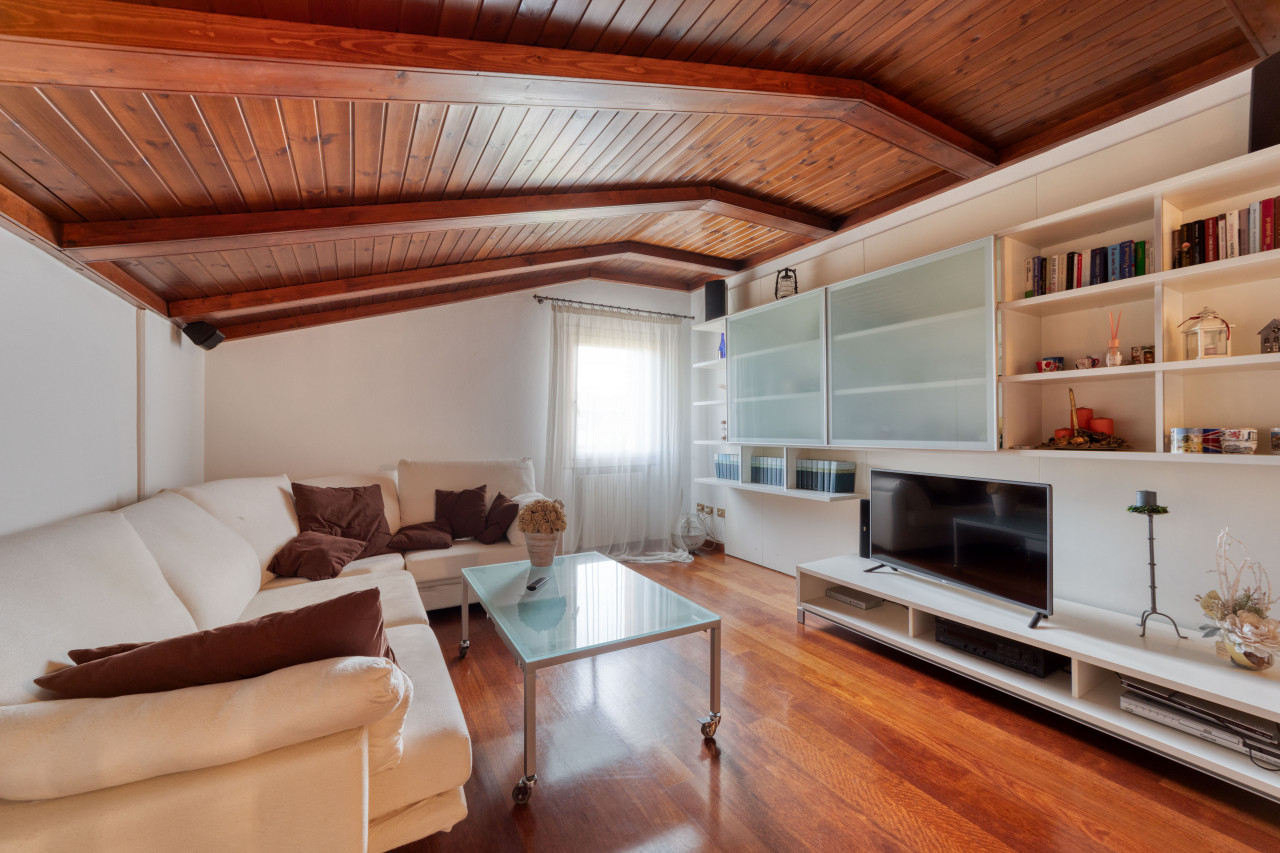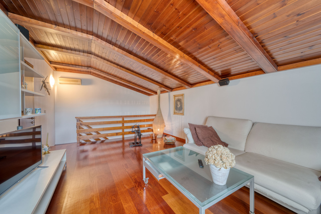 Attualmente al primo piano vi accoglie un luminosissimo soggiorno con affaccio sul balcone panoramico verso il verde circostante, cucina abitabile dotata di dispensa separata e due camere da letto (matrimoniale e doppia), entrambe collegate al secondo balcone. Il bagno principale è anch’esso finestrato. Salendo in mansarda si apre una suggestiva zona open space travata a vista – facilmente personalizzabile creando ulteriori camere oppure suite padronale con servizio dedicato.