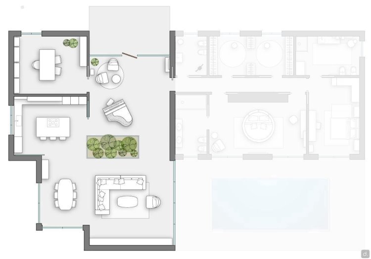 Se non interessa il garage doppio, le altezze e la dimensione permettono di trasformarlo in un'AMPIA ZONA GIORNO CON VETRATE VERSO IL GIARDINO come da rendering allegato al servizio fotografico. In questo caso le macchine potranno usufruire di uno spazio coperto alternativo e nel piano principale si potranno ricavare numerose stanze e bagni.